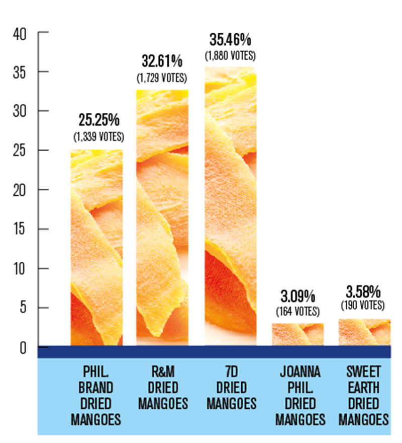 7D DRIED MANGOES. This is another neck-and-neck contest. 7D Dried Mangoes garnered 1,880 votes or 35.46 percent of the 5,302 survey participants. Close to 7D Dried Mangoes is R & M with 32.61 percent or 1,729 votes.